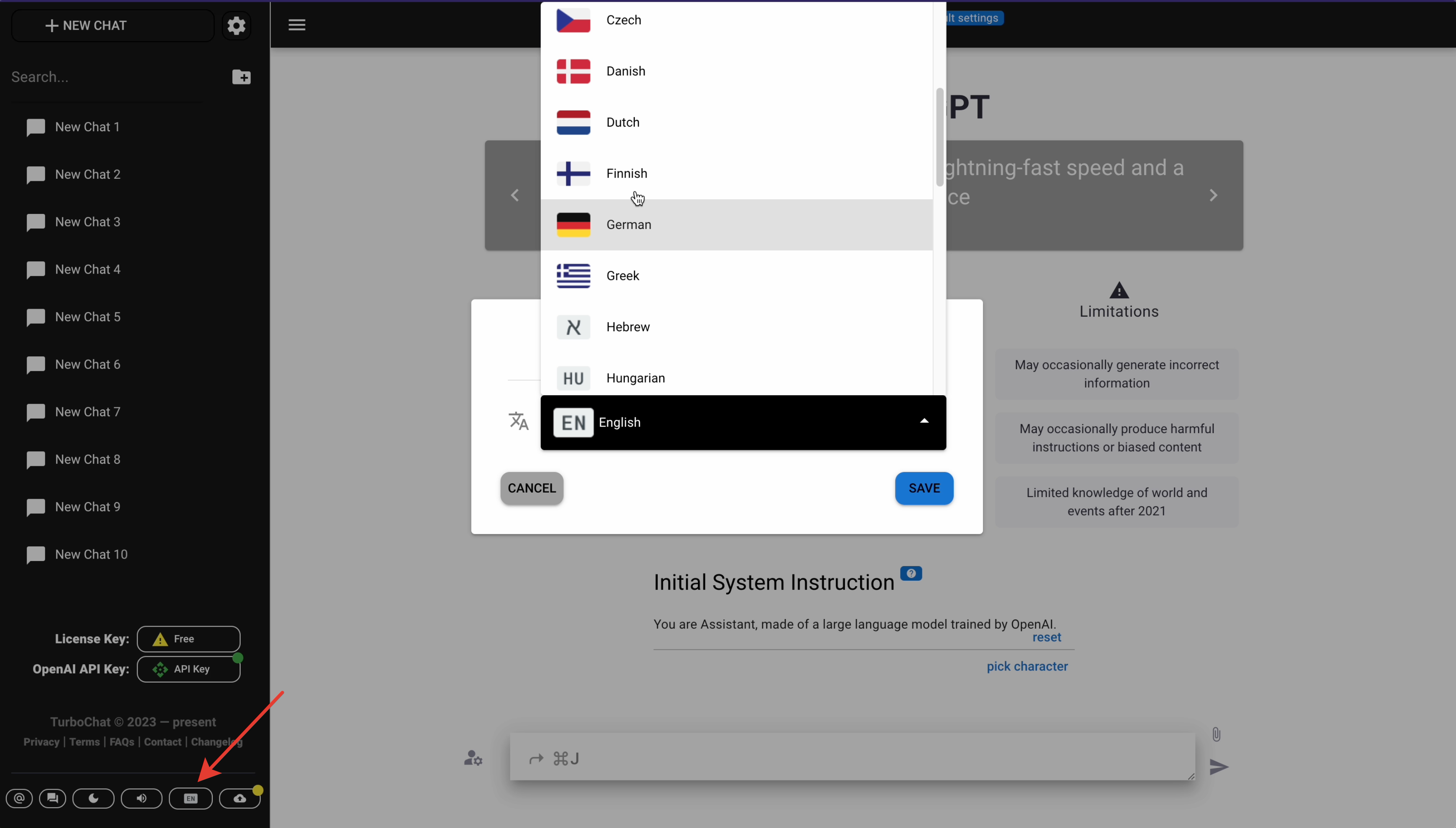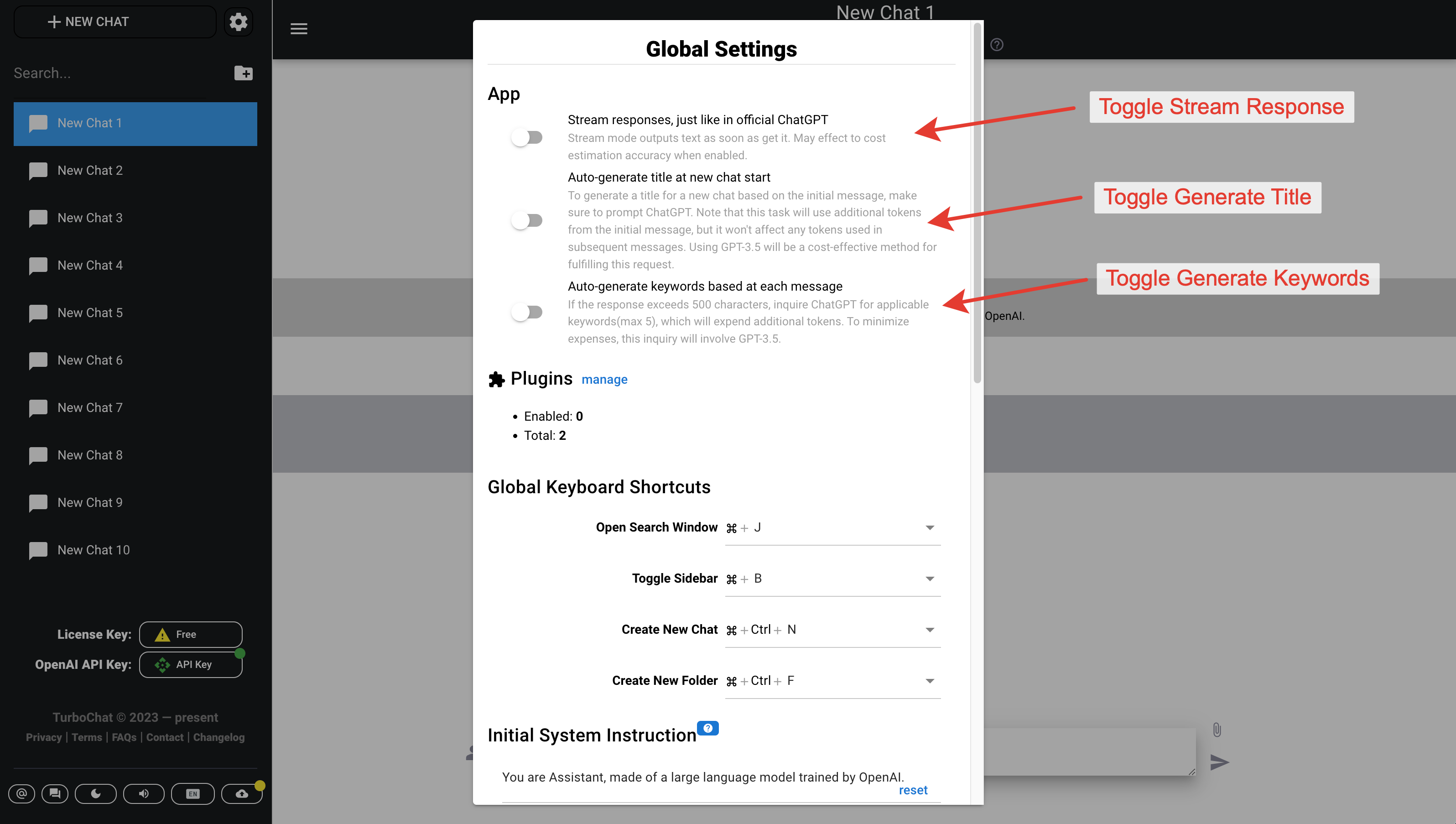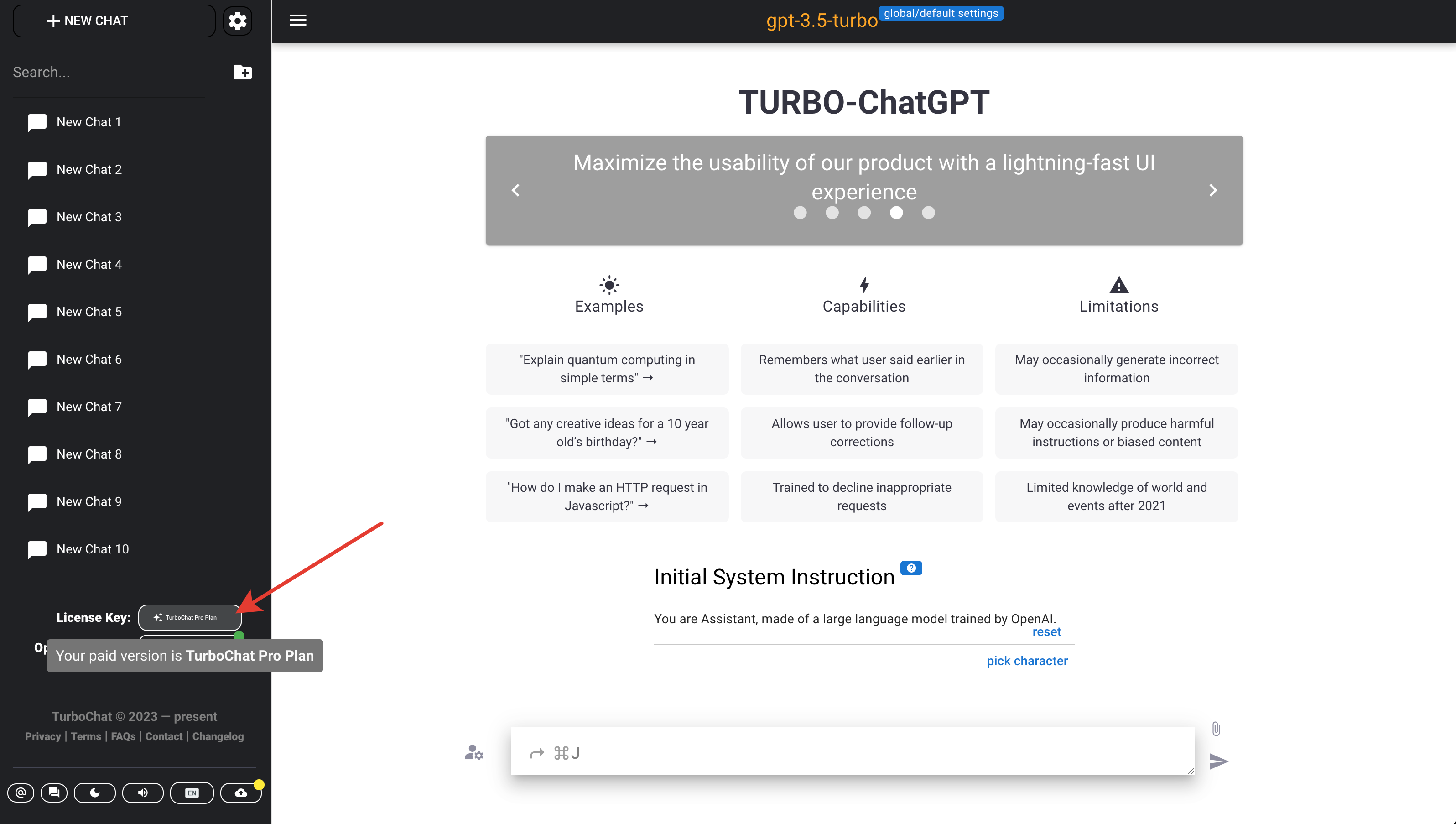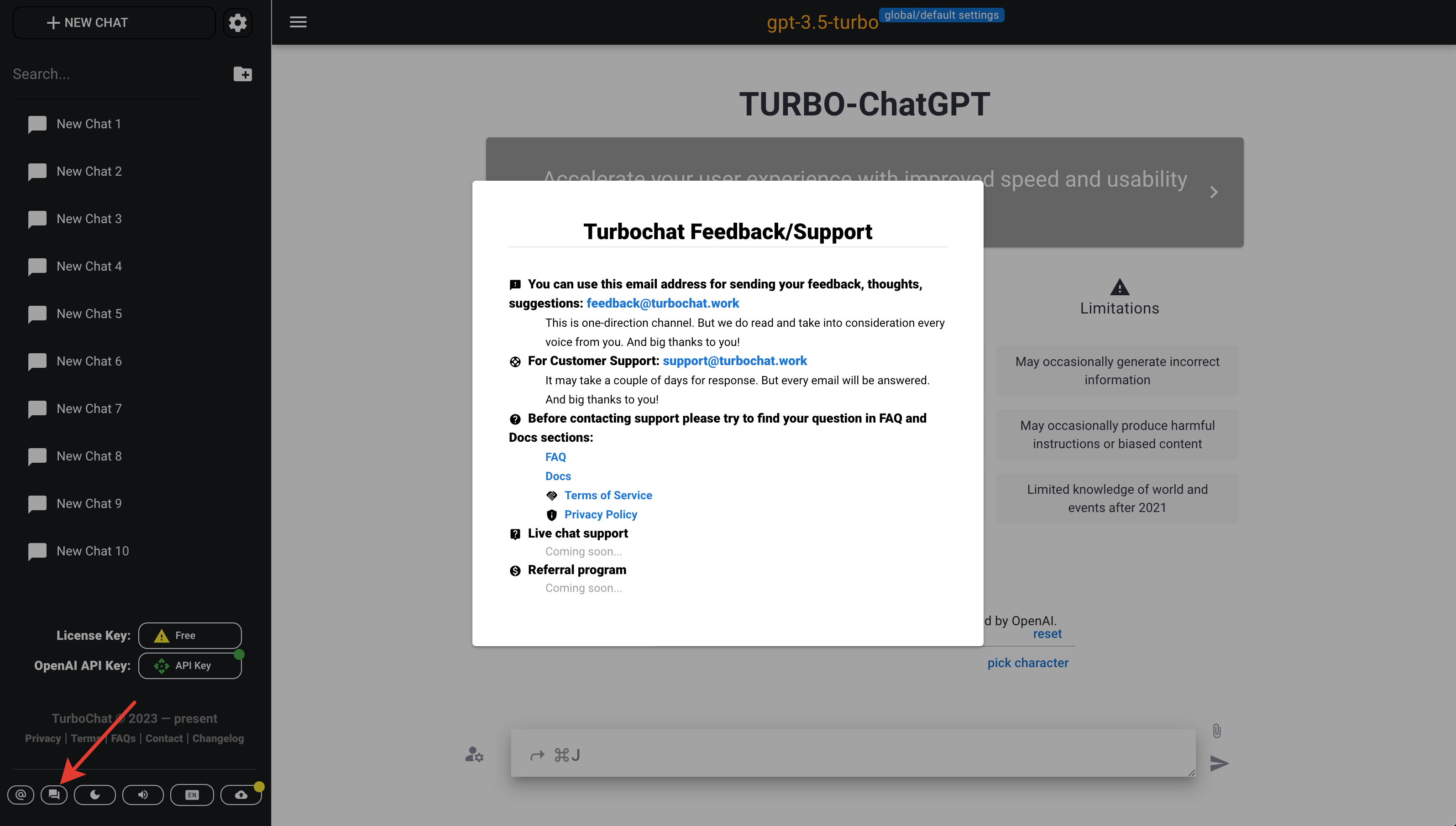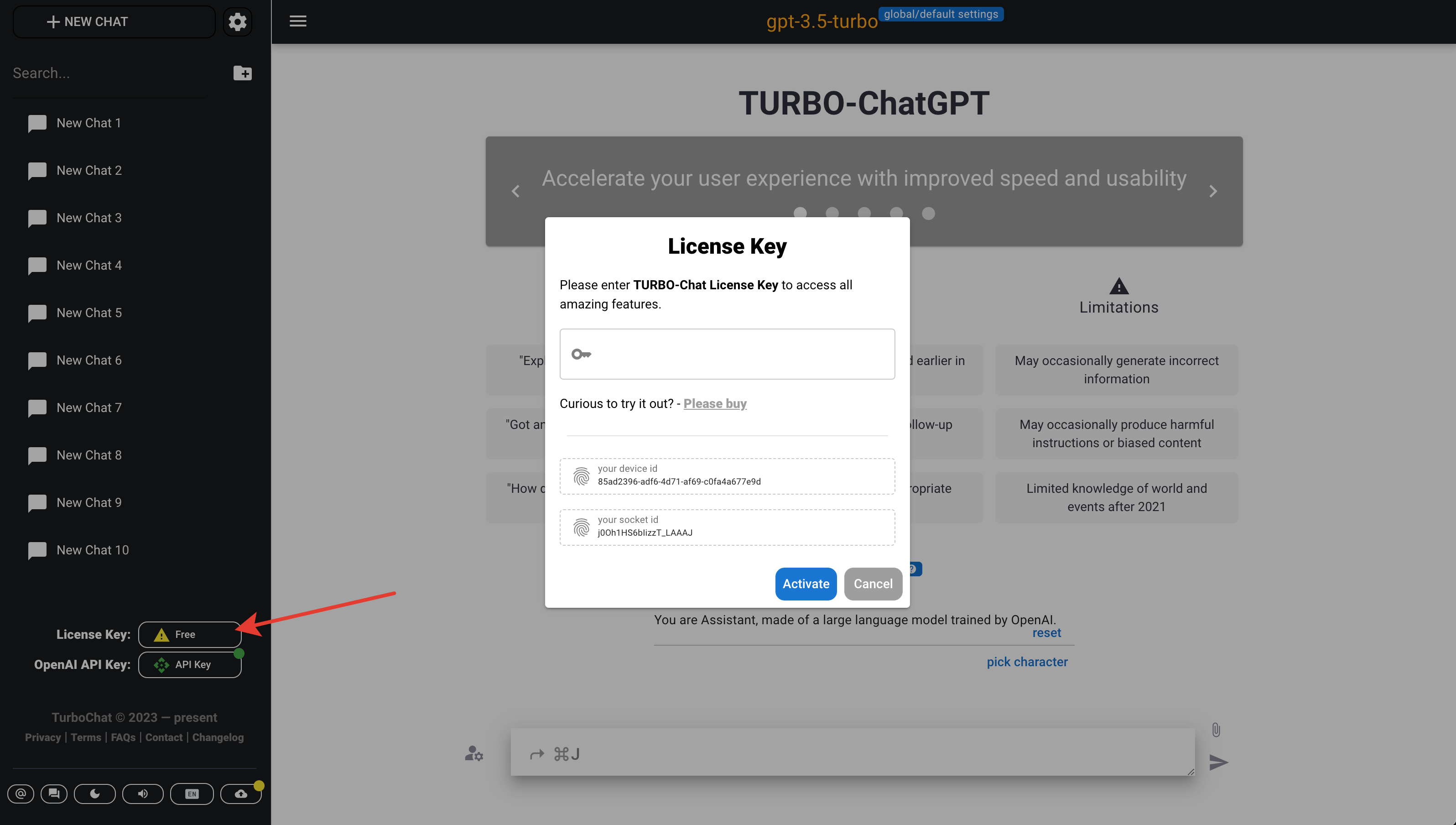 - Button shows current paid plan if license key applied or "Free" if no license key.